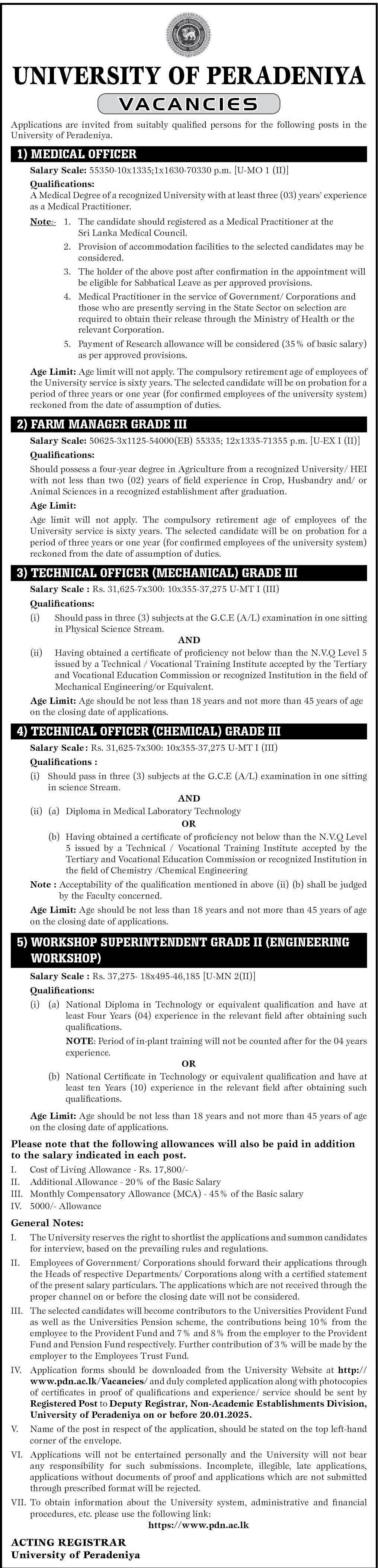 Medical Officer, Farm Manager, Technical Officer - University of Peradeniya