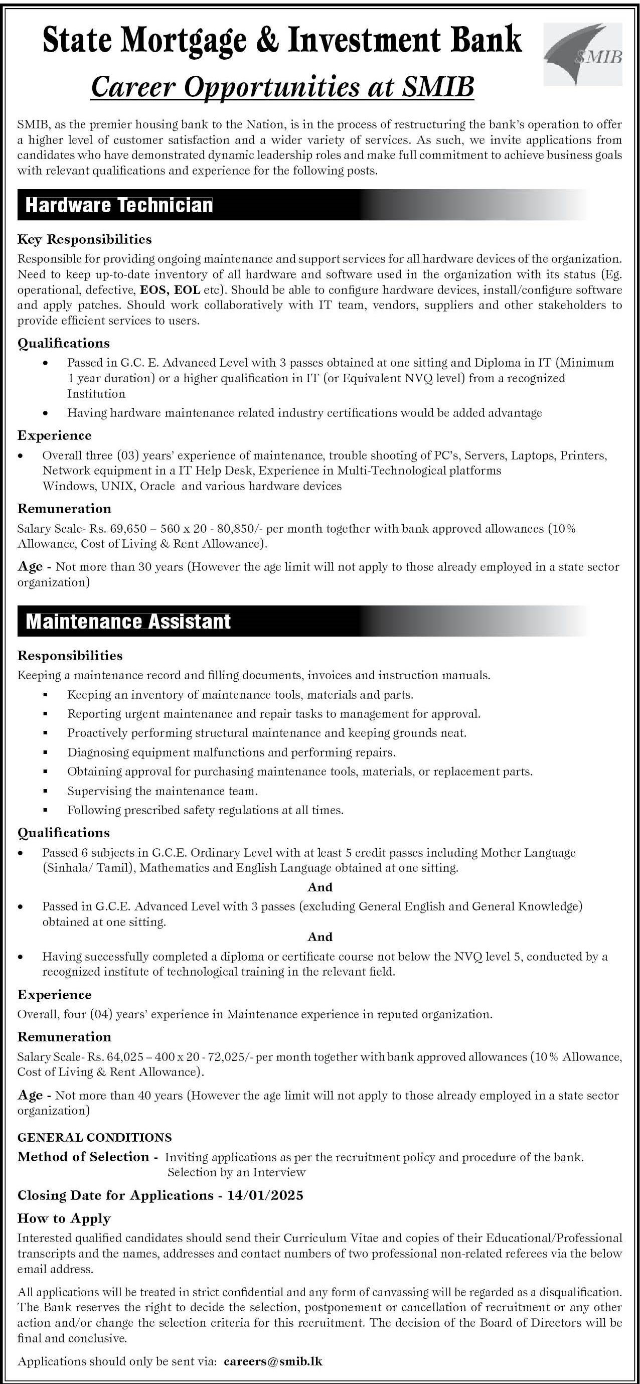 Hardware Technician, Maintenance Assistant - State Mortgage and Investment Bank