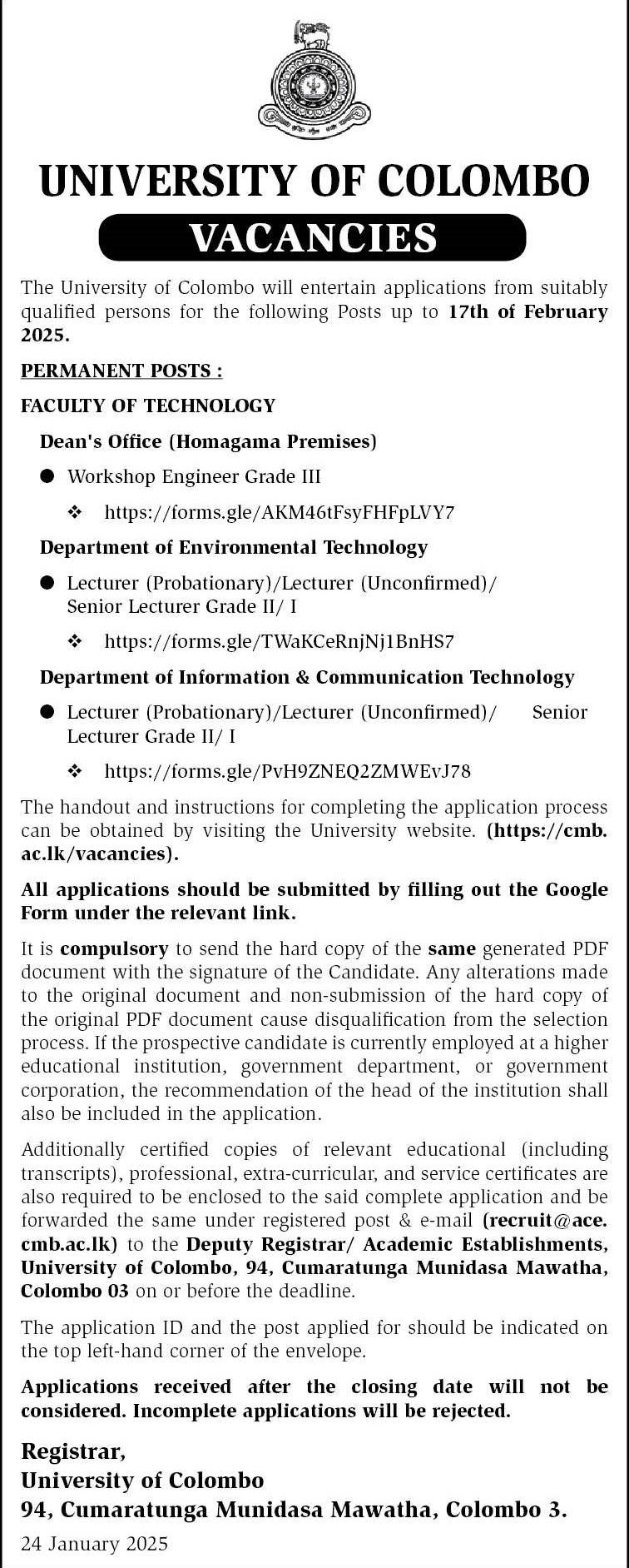 Workshop Engineer, Senior Lecturer, Lecturer - University of Colombo