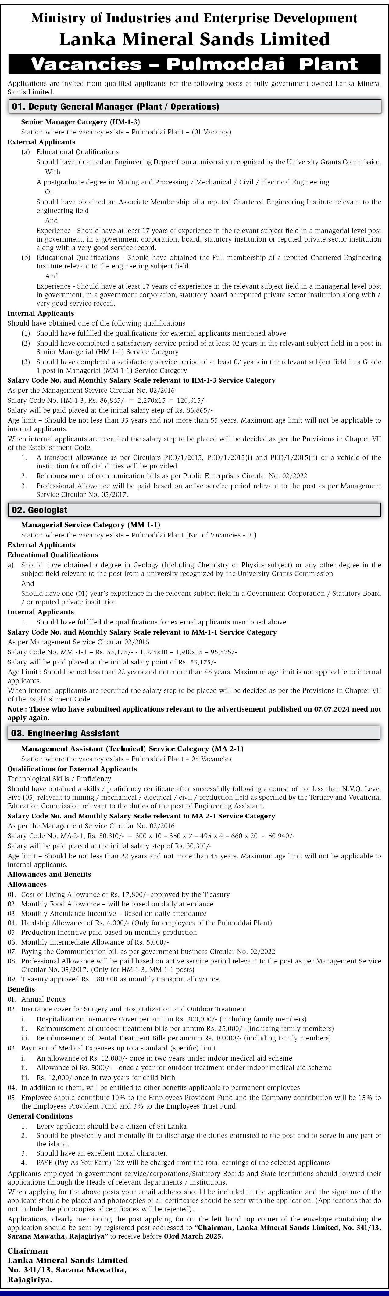 Deputy General Manager, Geologist, Engineering Assistant - Lanka Mineral Sands Limited