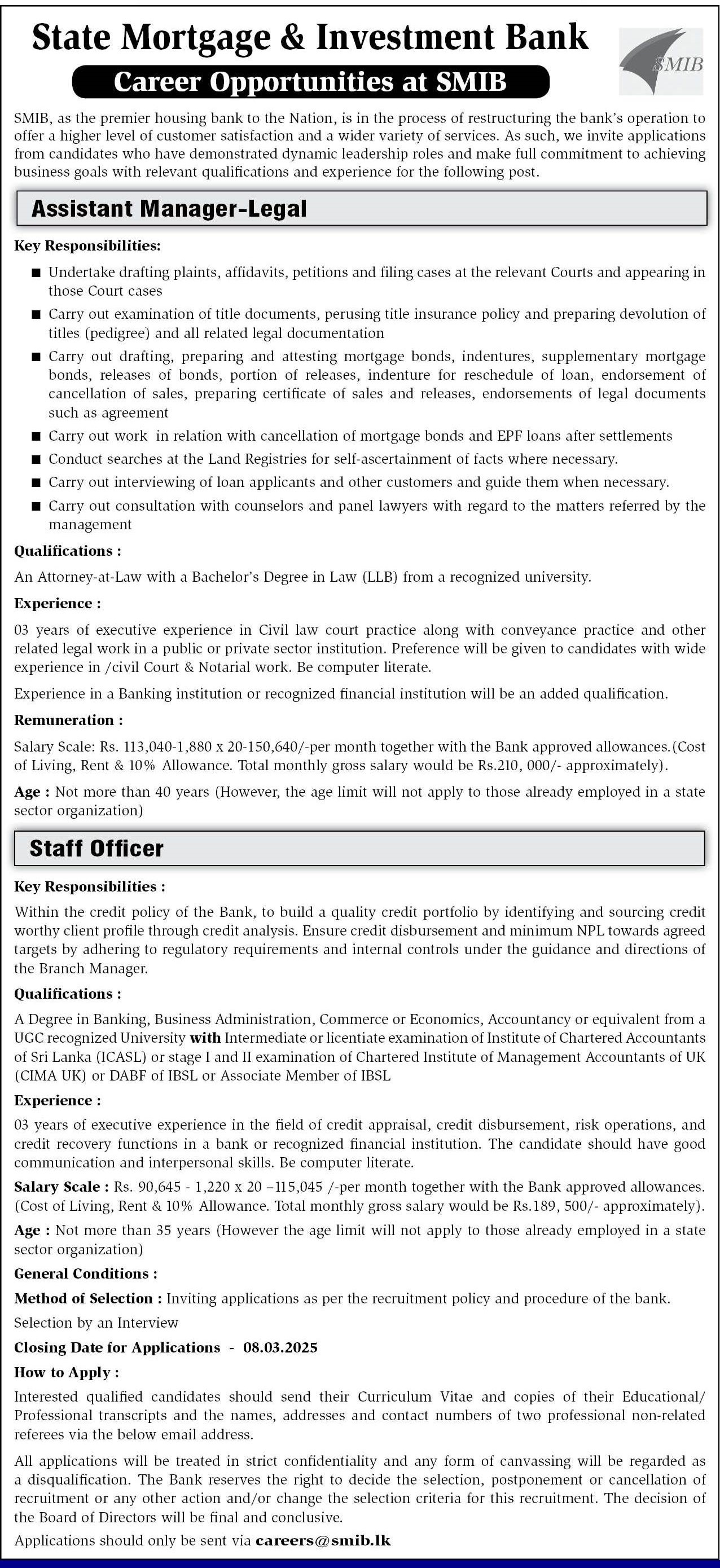 Assistant Manager, Staff Officer - State Mortgage and Investment Bank