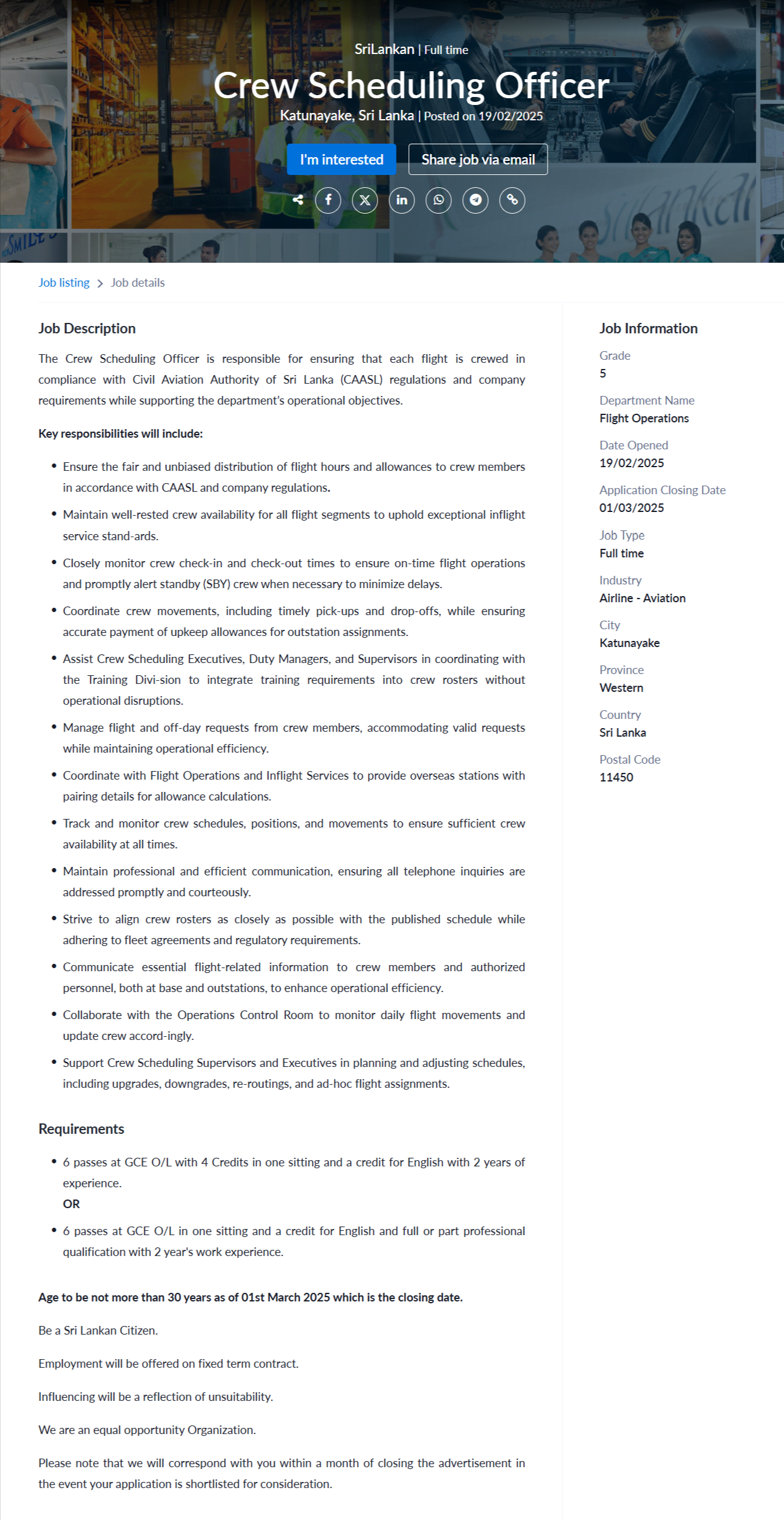 Crew Scheduling Officer - SriLankan Airlines