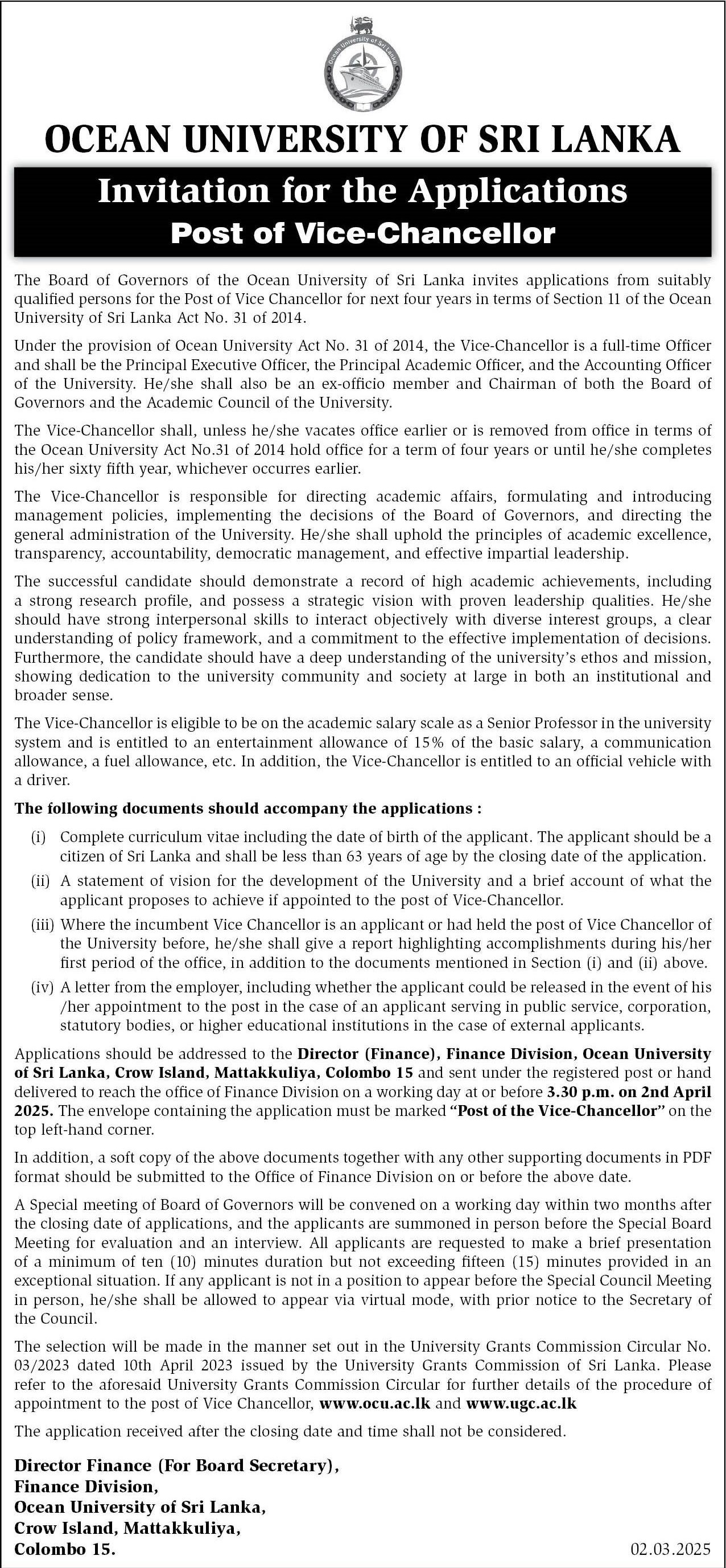 Vice Chancellor - Ocean University of Sri Lanka