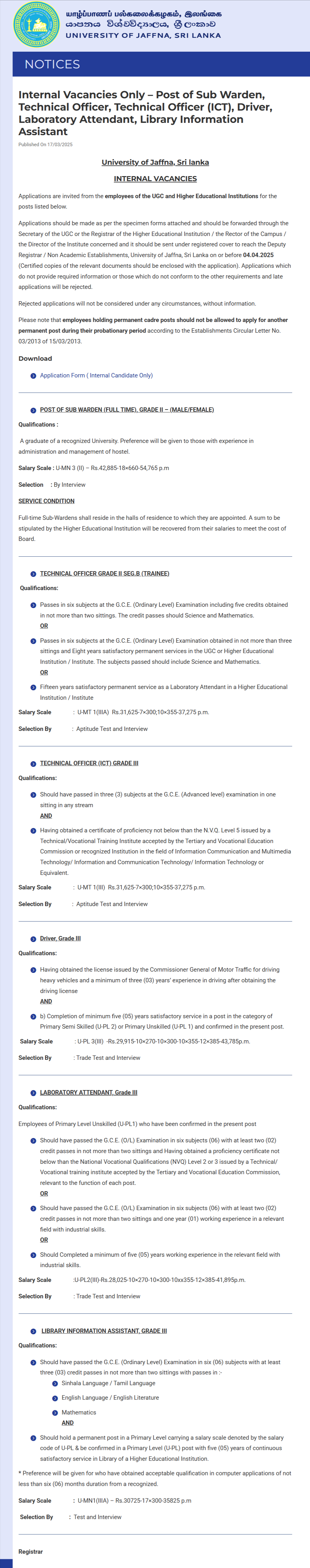 Sub Warden, Technical Officer, Driver - University of Jaffna