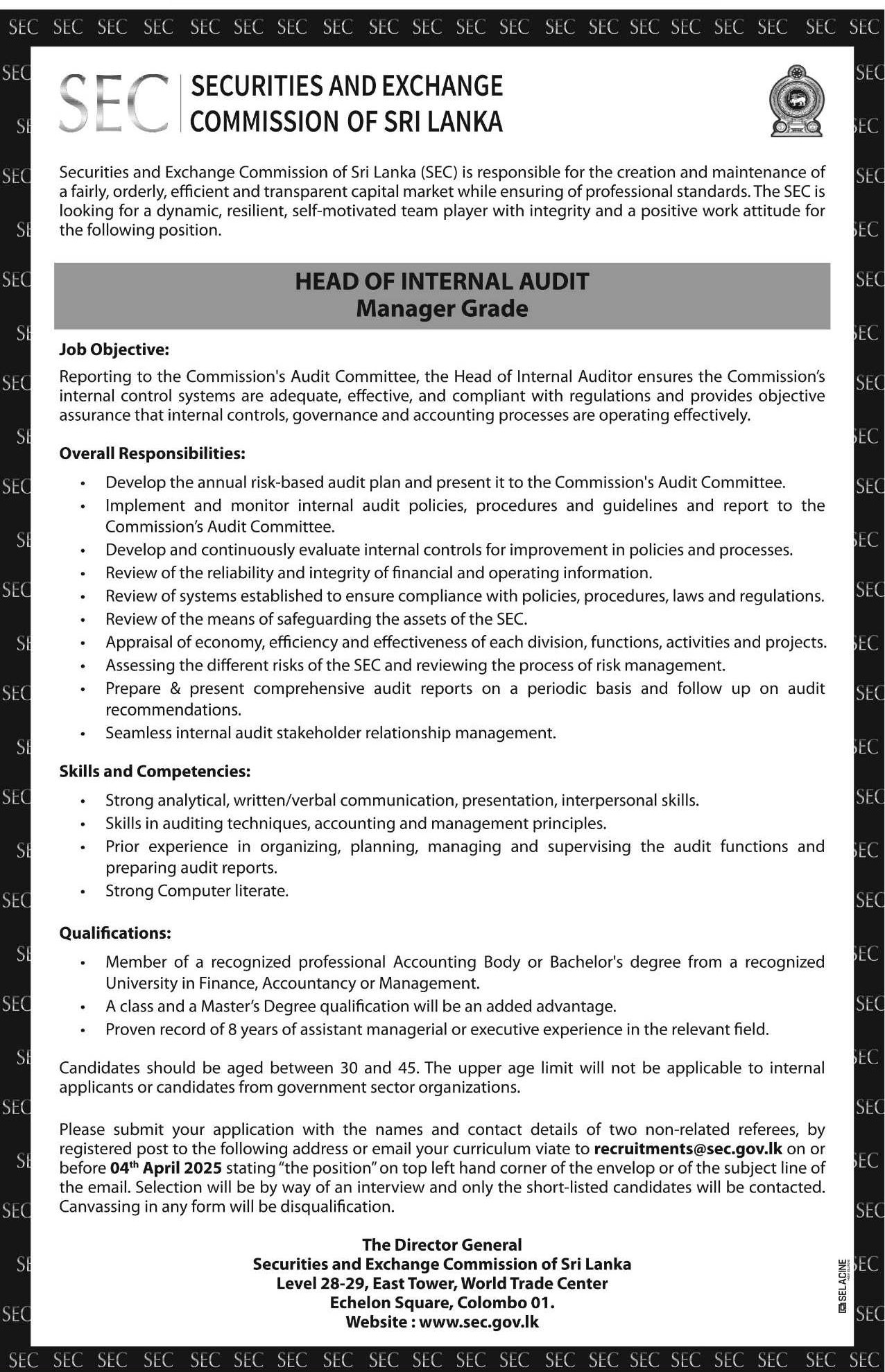 Head of Internal Audit - Securities and Exchange Commission of Sri Lanka