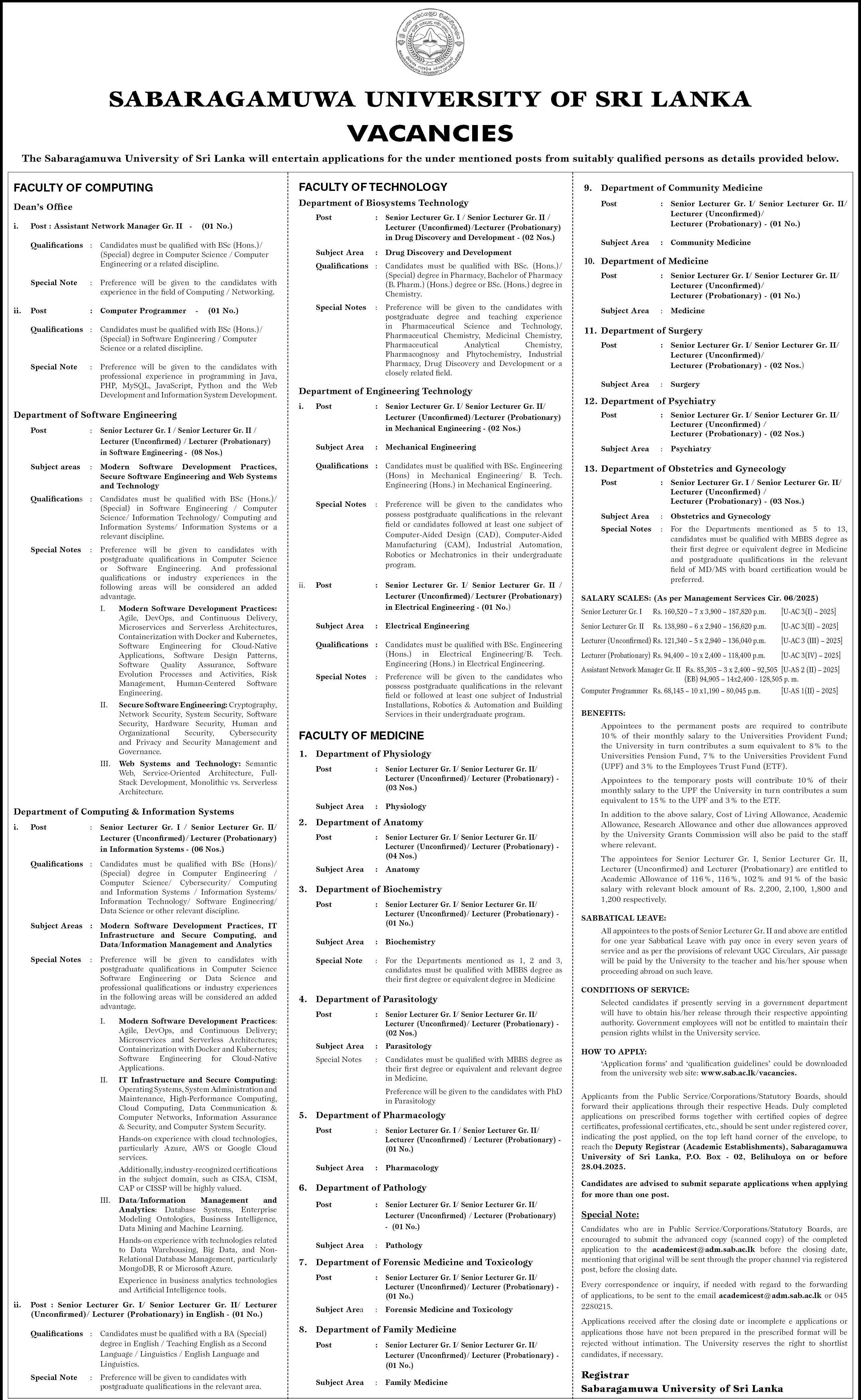 Senior Lecturer, Lecturer, Assistant Network Manager, Computer Programmer - Sabaragamuwa University