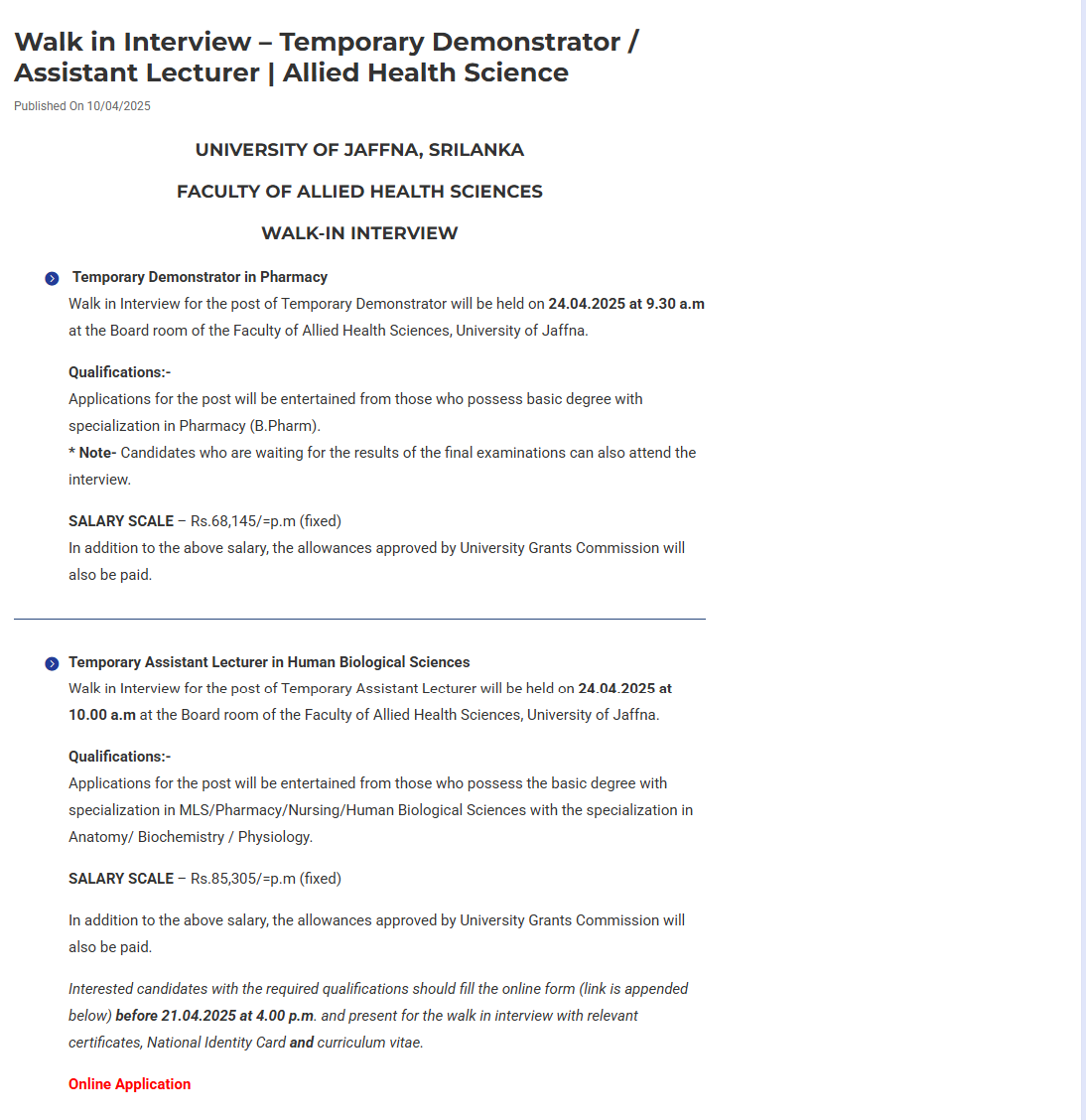 Demonstrator, Assistant Lecturer - University of Jaffna