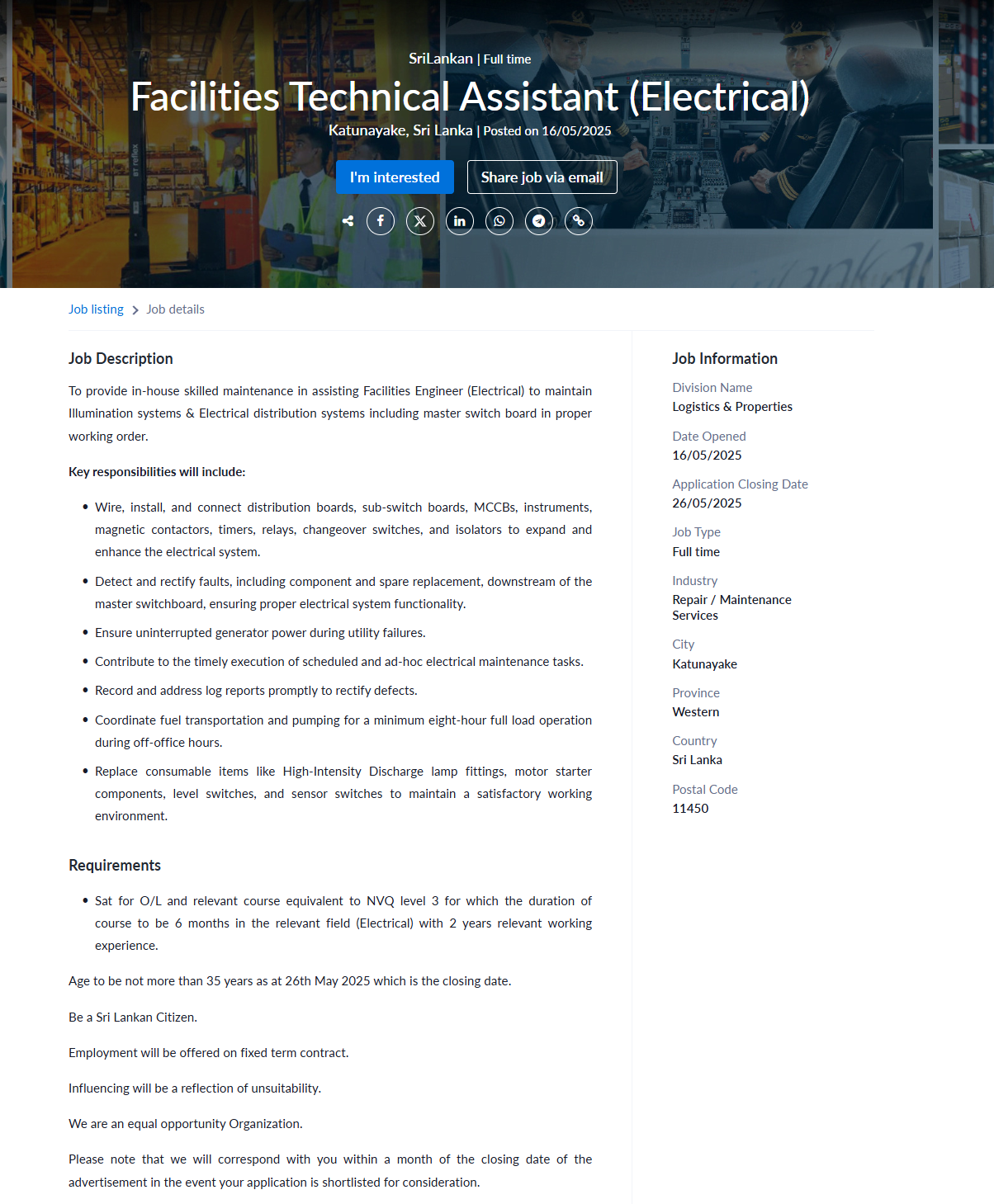 Facilities Technical Assistant (Electrical) - SriLankan Airlines