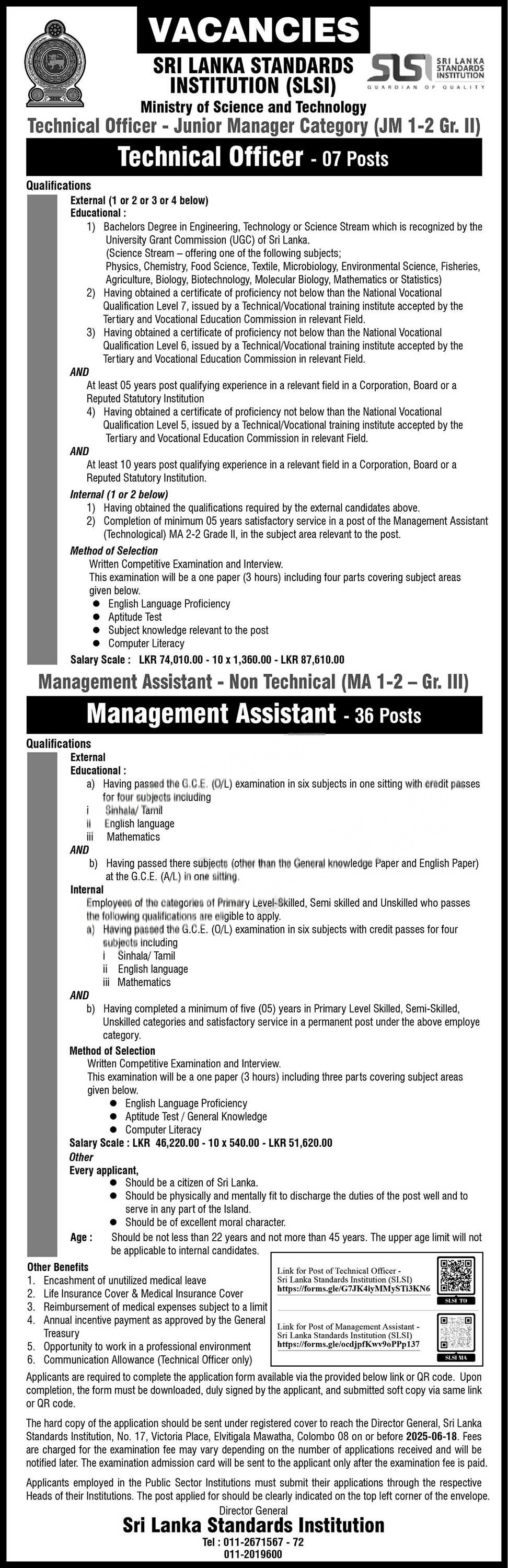 Technical Officer, Management Assistant - Sri Lanka Standards Institution