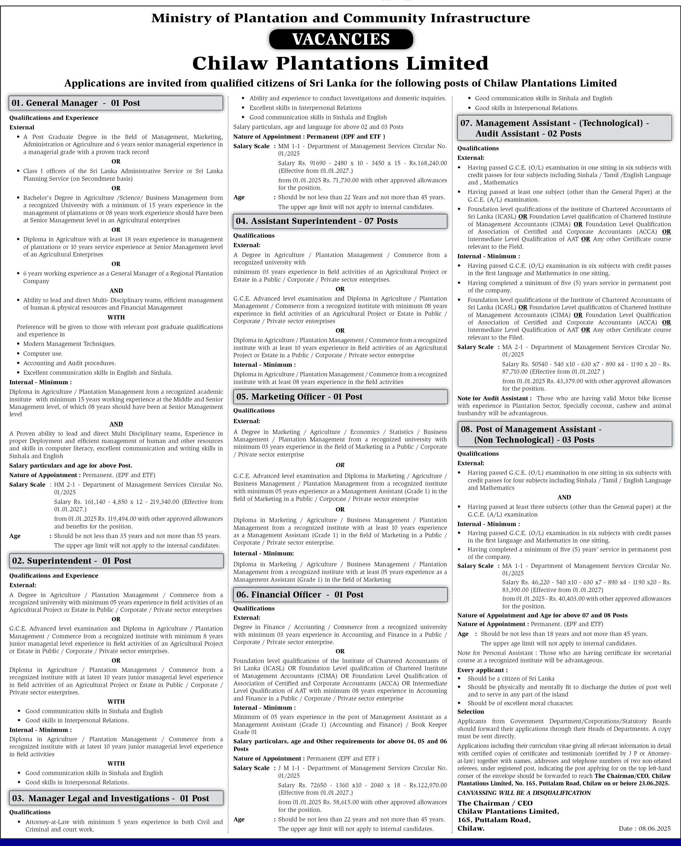 General Manager, Superintendent, Management Assistant - Chilaw Plantations Limited