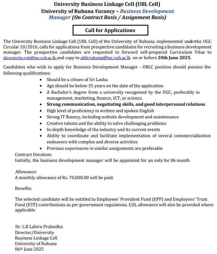 Business Development Manager - University of Ruhuna