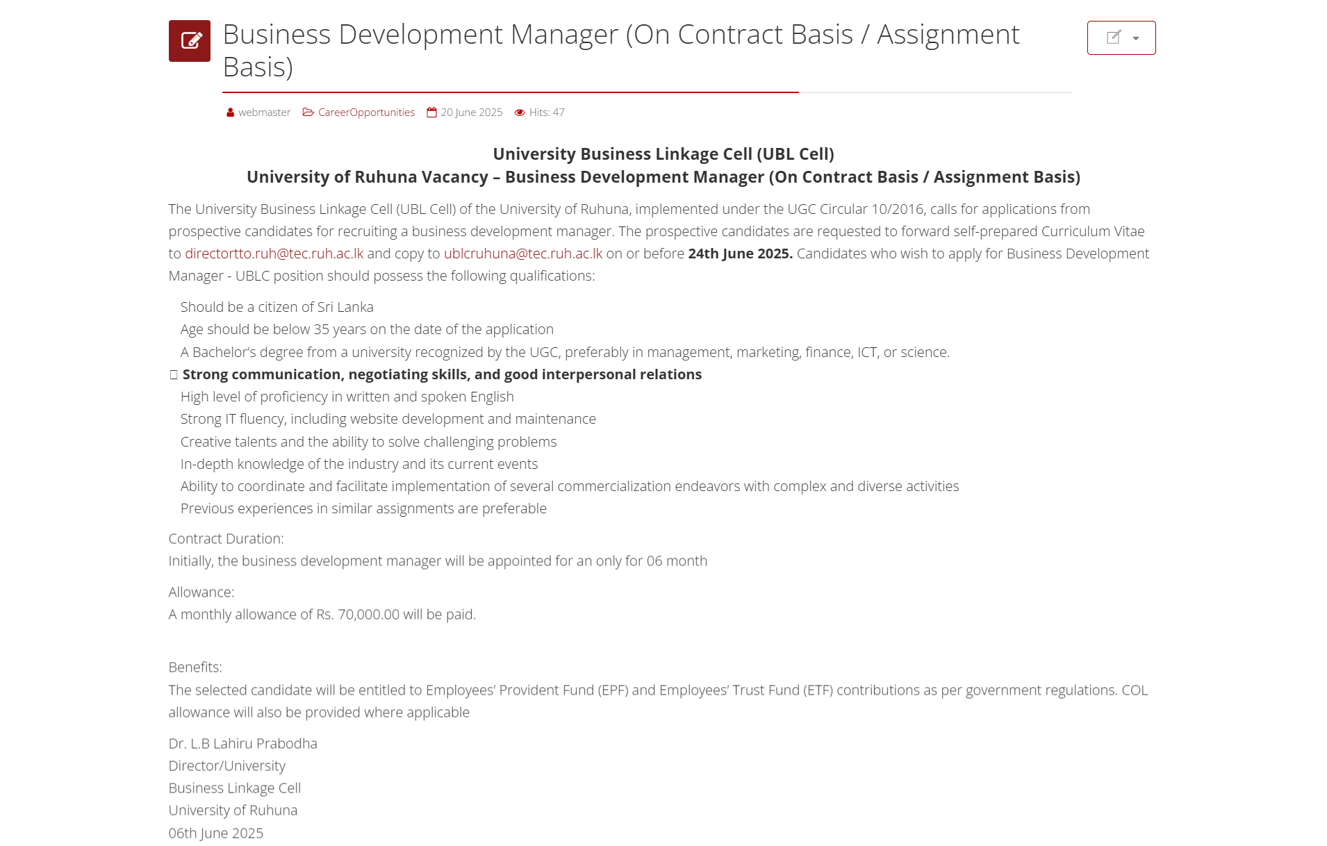 Business Development Manager - University of Ruhuna