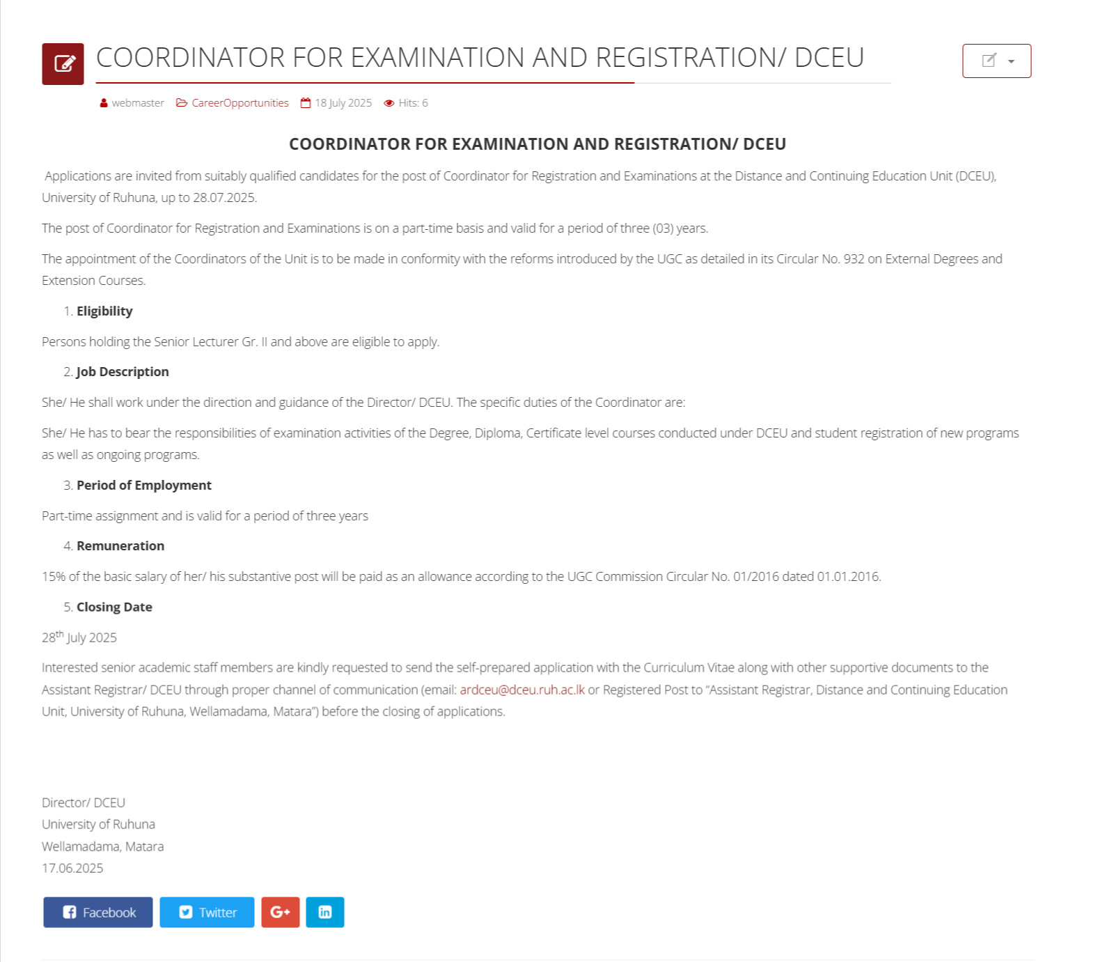 Coordinator - University of Ruhuna