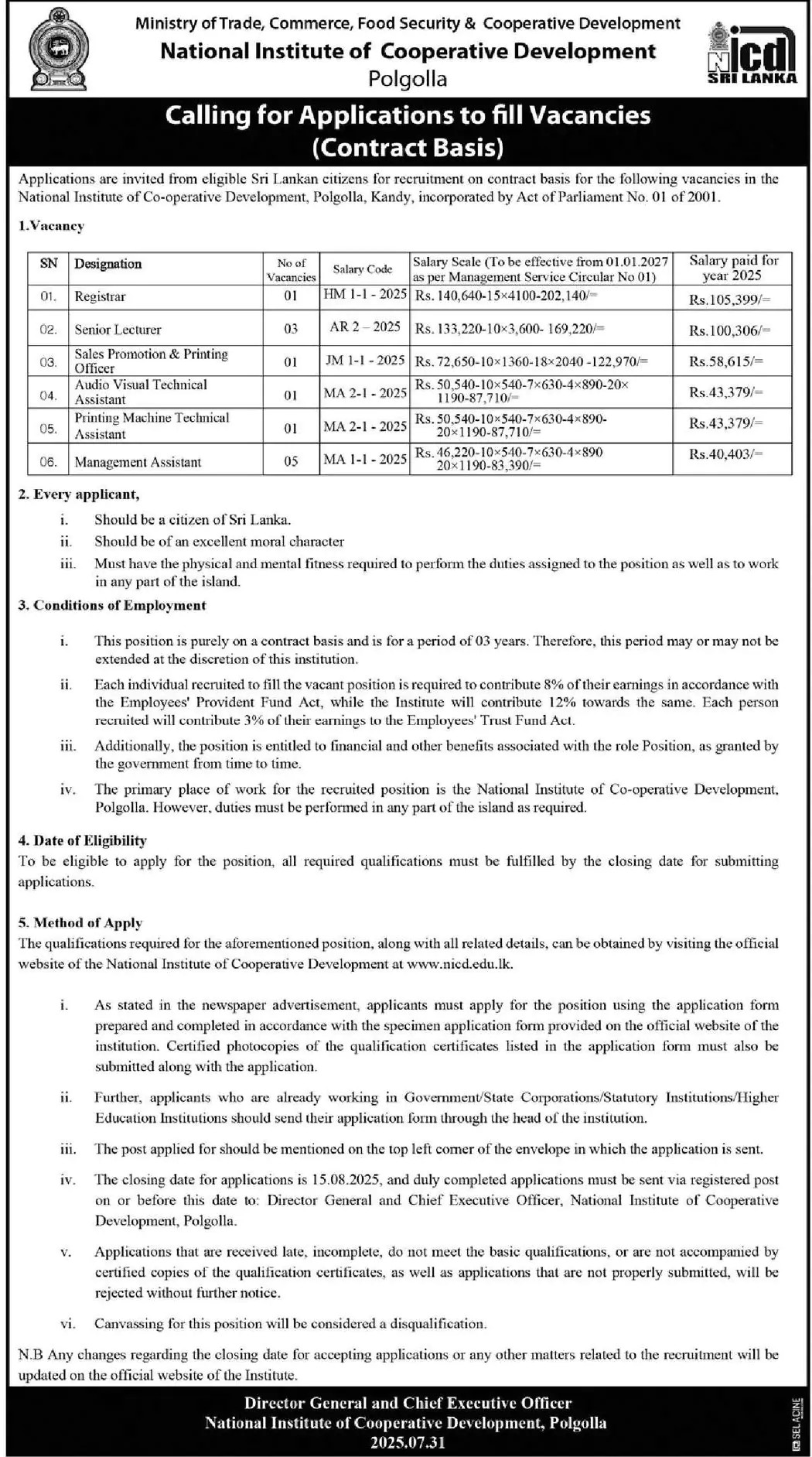 Registrar, Senior Lecturer, Management Assistant - National Institute of Cooperative Development