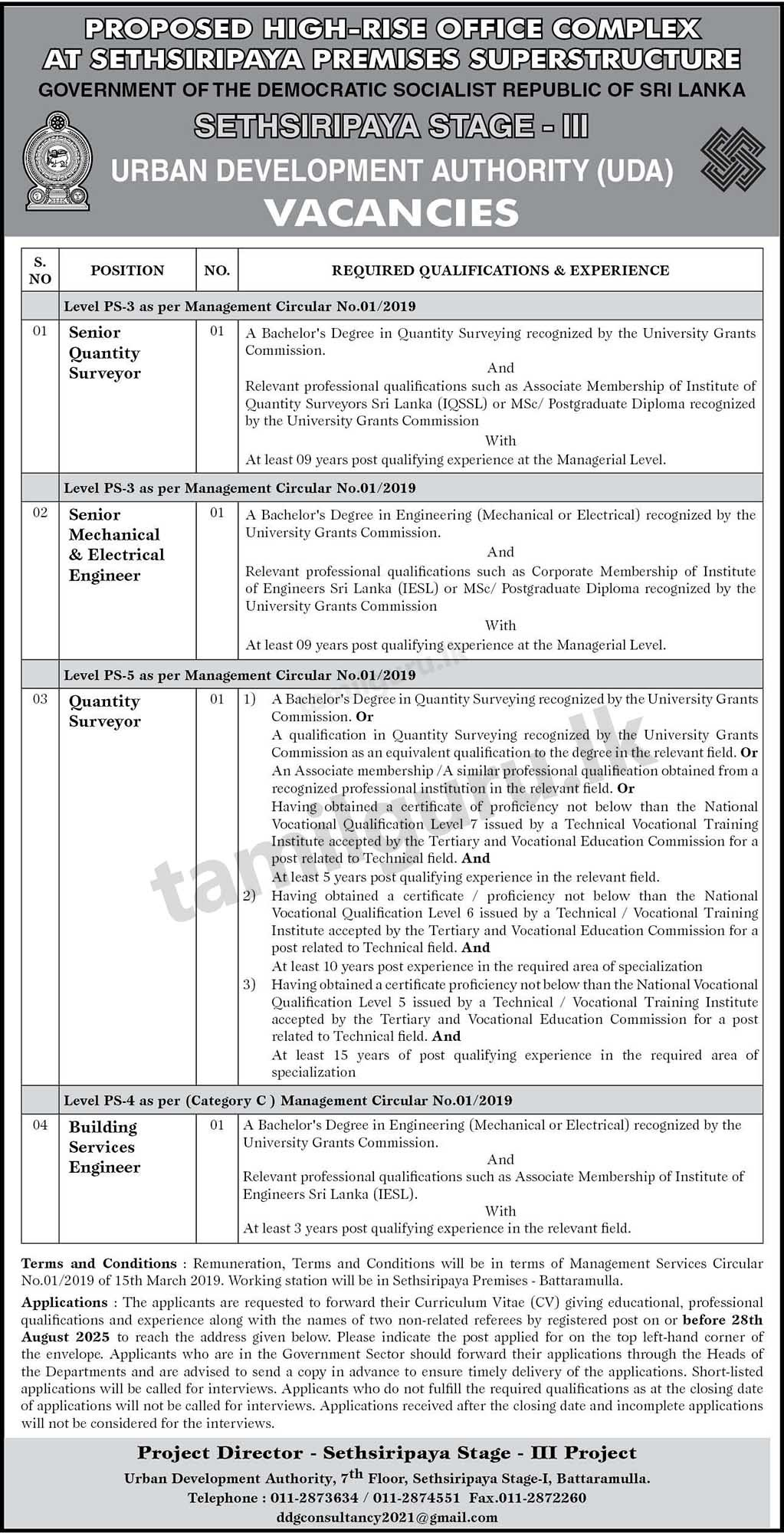 Senior Quantity Surveyor, Senior Mechanical Engineer, Quantity Surveyor - Urban Development Authority
