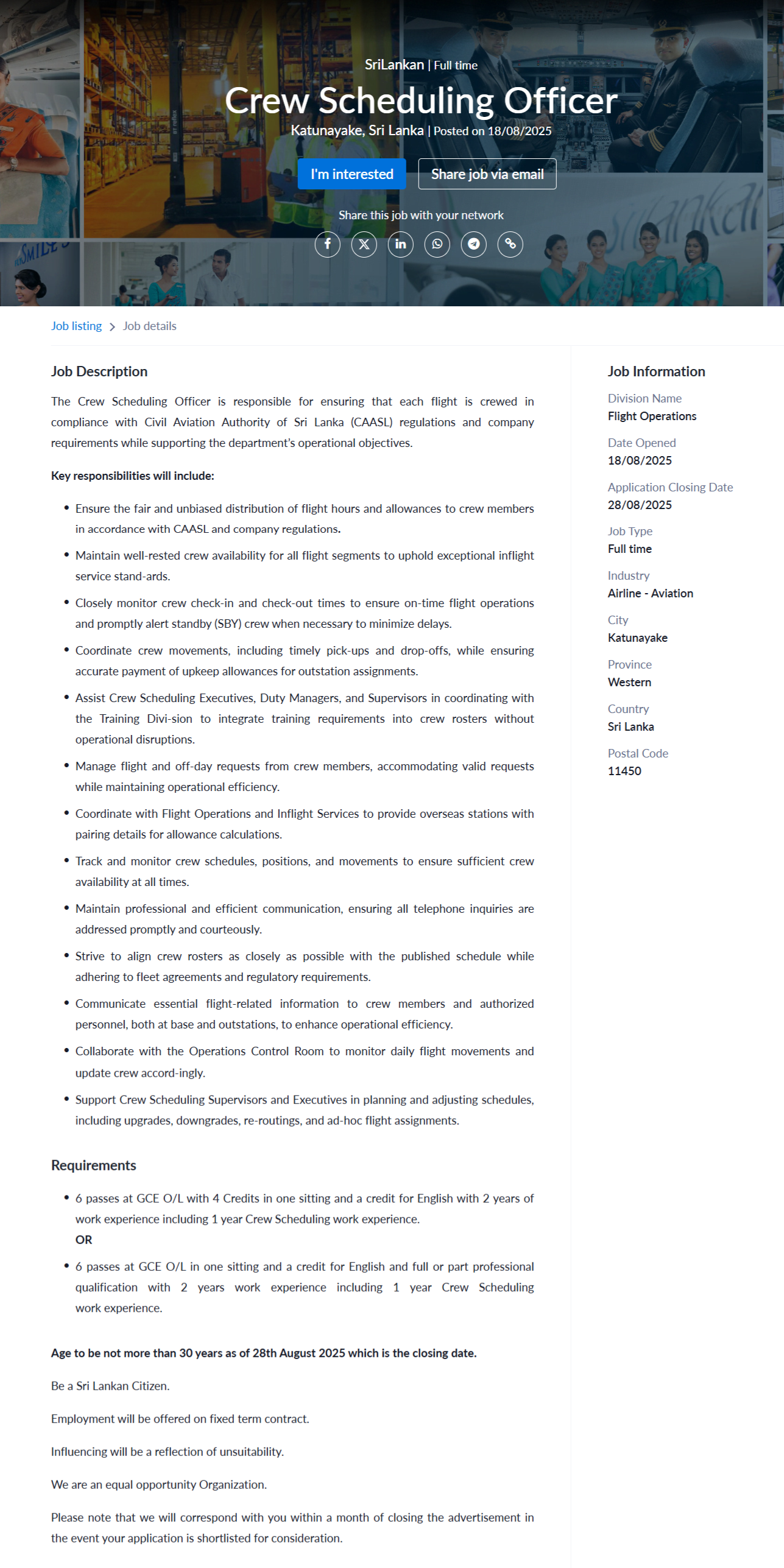 Crew Scheduling Officer - SriLankan Airlines
