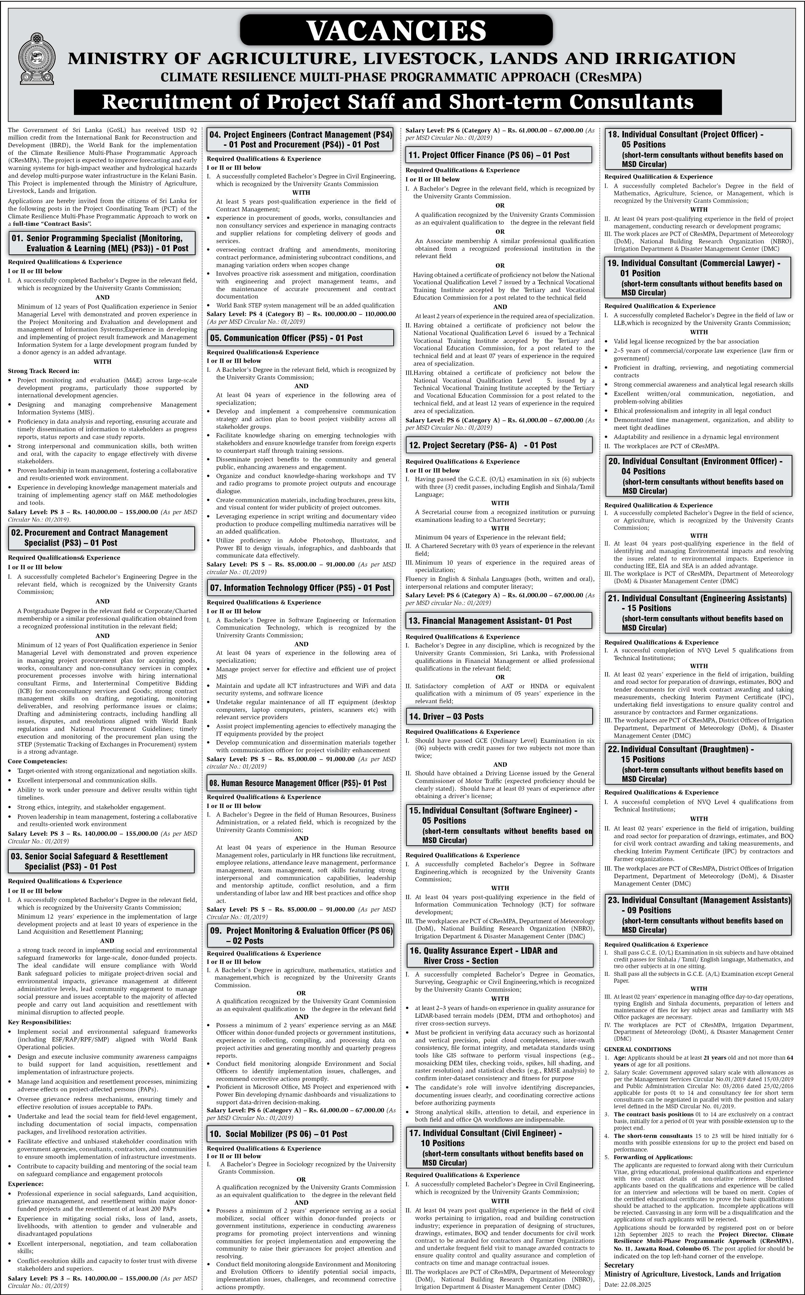 Senior Program Specialist, Procurement and Contract Management Specialist, Project Engineer - Ministry of Agriculture