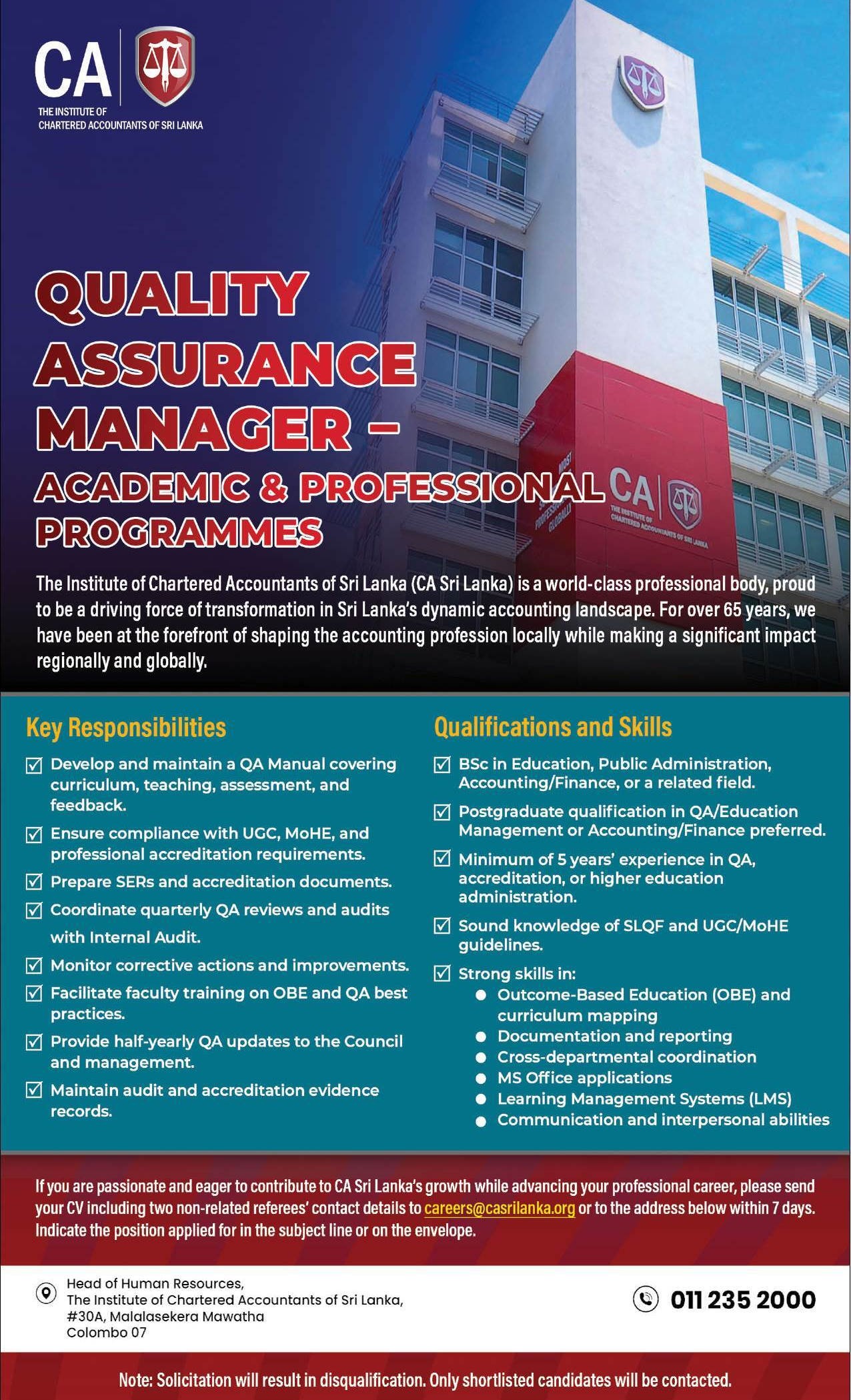 Quality Assurance Manager - Institute of Chartered Accountants of Sri Lanka