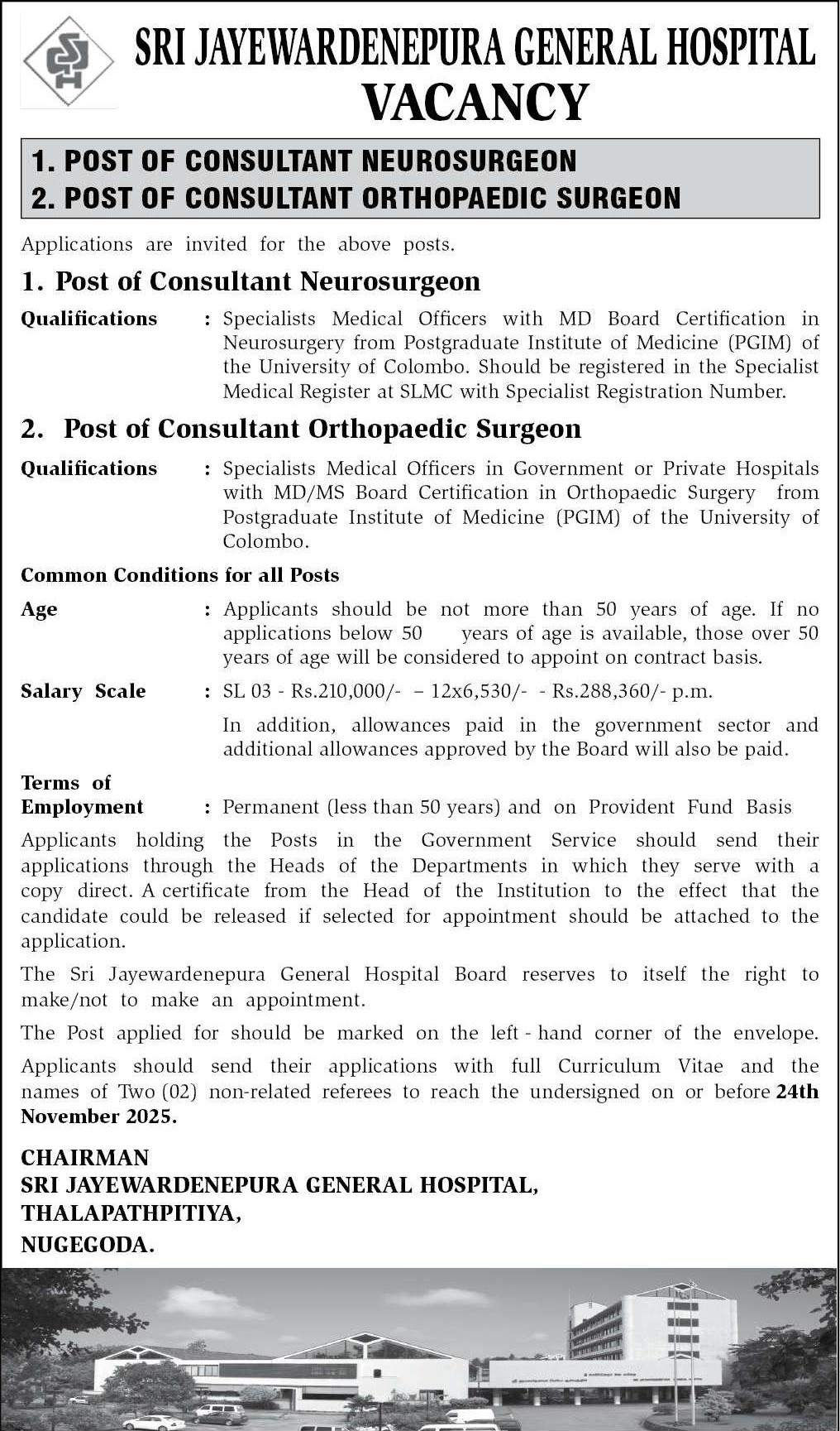 Consultant Neuro Surgeon, Consultant Orthopaedic Surgeon - Sri Jayewardenepura General Hospital