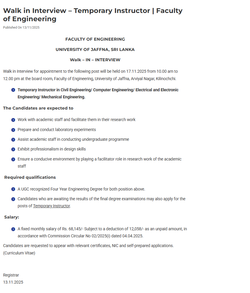 Instructor - University of Jaffna