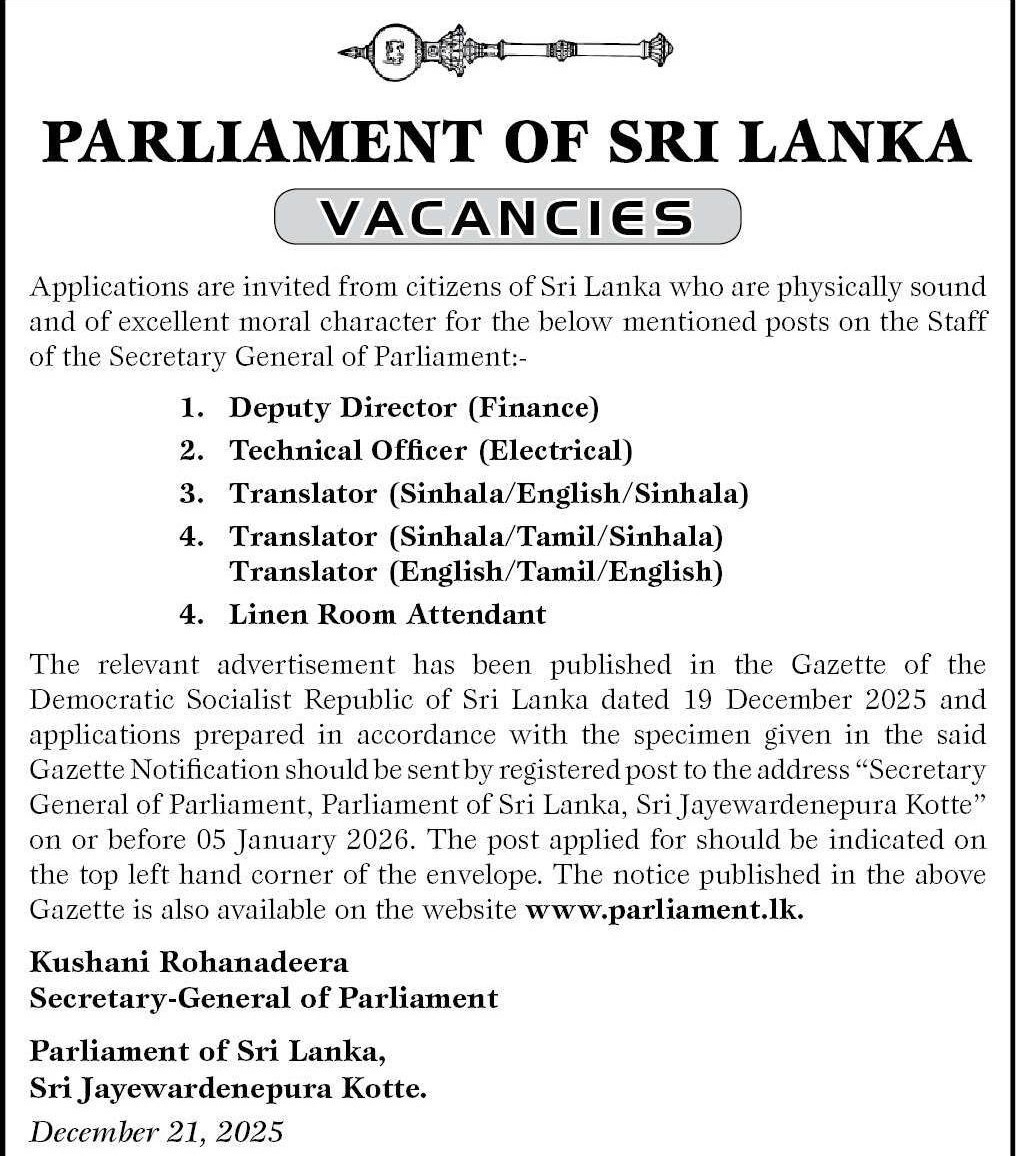 Deputy Director, Technical Officer, Translator - Parliament of Sri Lanka