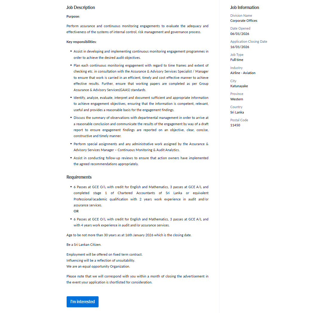 Assurance & Advisory Services Supervisor - SriLankan Airlines